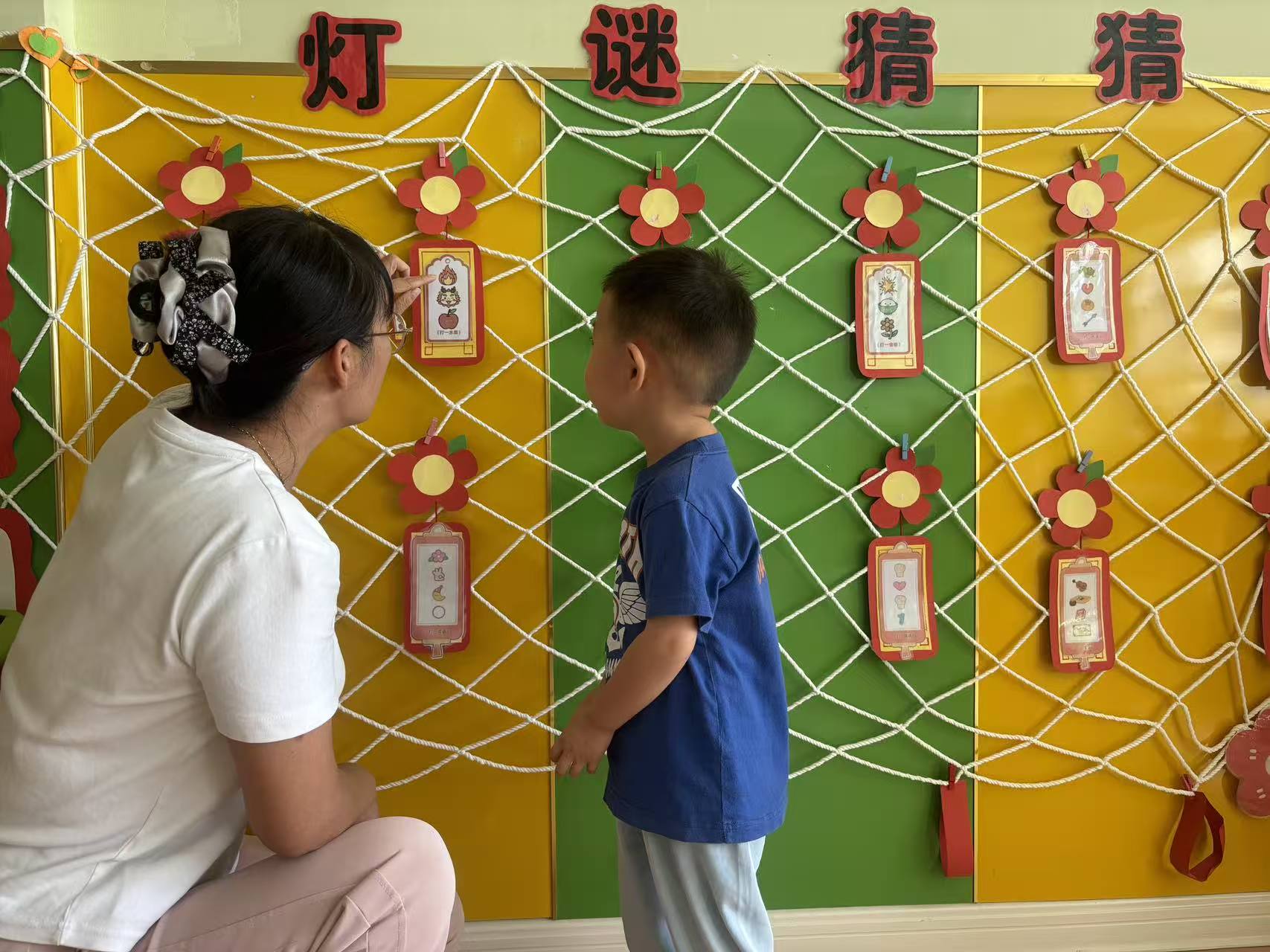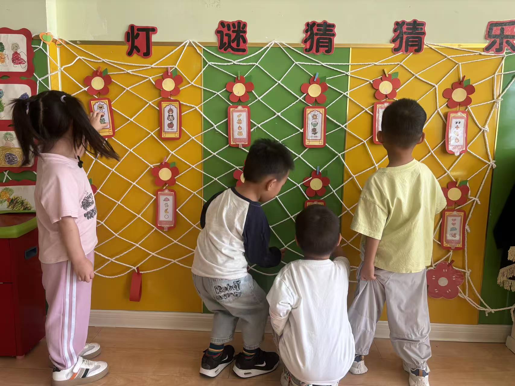 中秋节前,教师带领孩子们在长廊上举办有趣生动的“灯谜游戏会”,让孩子们在看花灯、趣猜灯谜的游戏中感受中秋节欢乐祥和的节日气息。