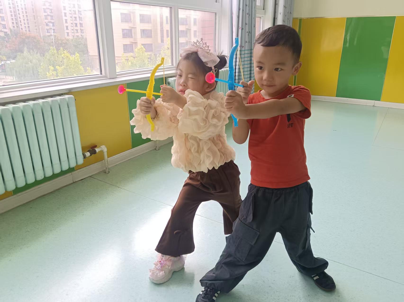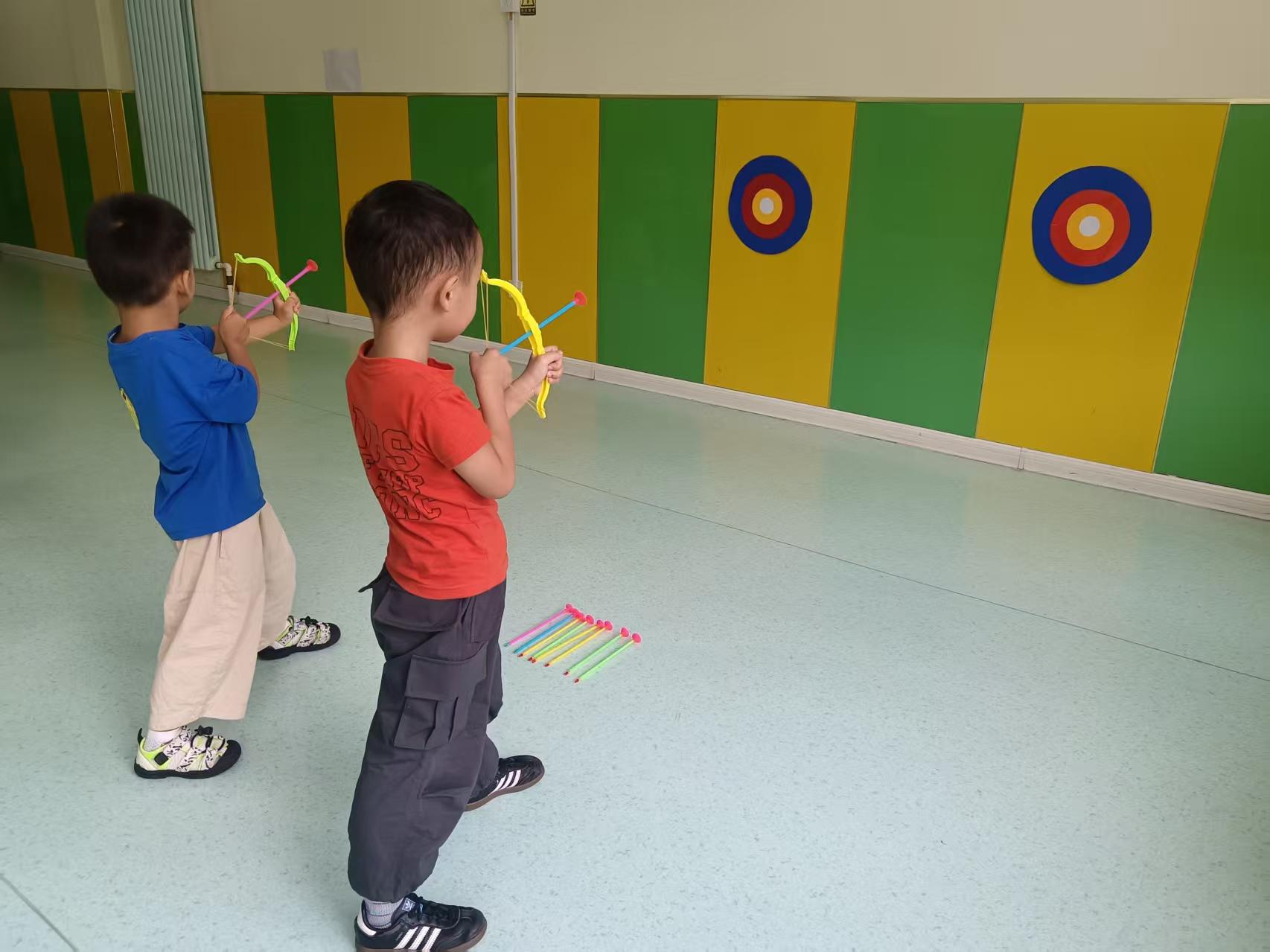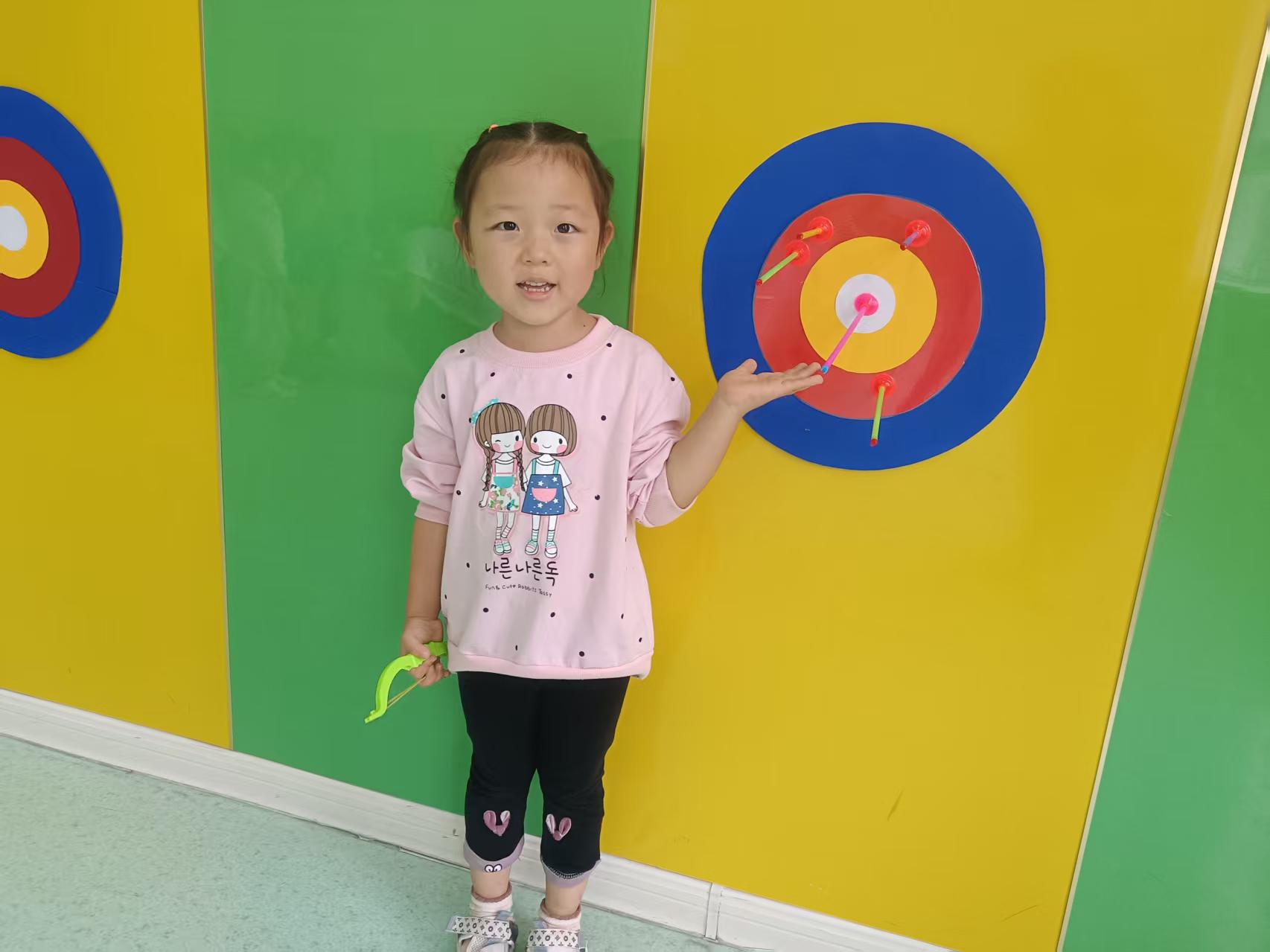 看!小朋友正在玩“中秋趣射月”游戏,在欢乐中锻炼孩子手眼协调能力,传递节日氛围。